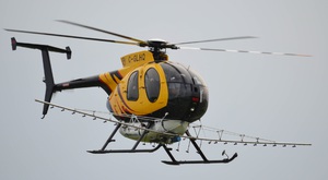 Simplex Aerospace Model 8500 Spray System for the MD 500. The system consists of a belly-mounted composite tank, which holds 341 liters/90 gallons of liquid. The forward mounted boom has a standard width of 8 meters (27 ft) or optional width of 11 meters (35 ft). Other features include an electrically driven spray pump and motor, and flow meter.